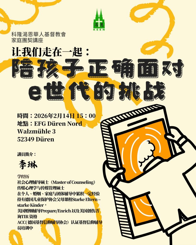 科隆渴恩华人基督教户家庭团契将举办“陪孩子正确面对e世代挑战”亲子讲座,欢迎家长们和新朋友参加。
